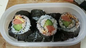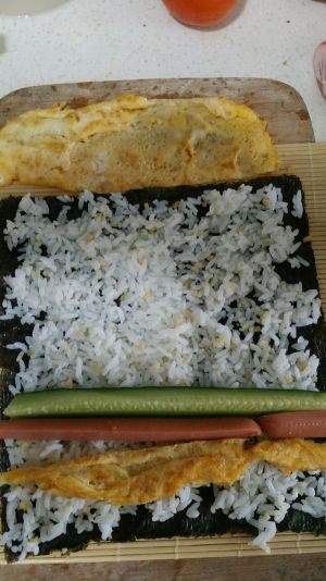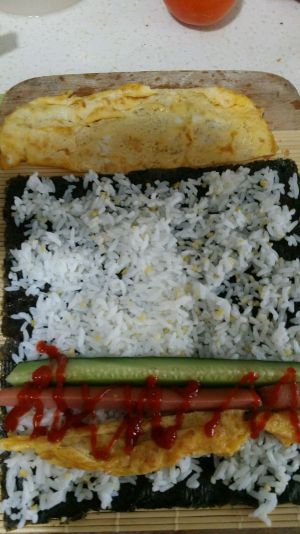 火腿,黄瓜切条形。鸡蛋打散,平底锅煎熟,然后依次铺好摆好。