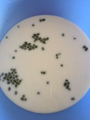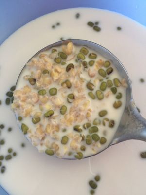 等加了冰糖的绿豆凉了,加入鲜奶。