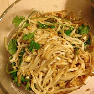 大蒜剁成蒜末,与香菜撒金针菇上。热锅倒入花生油酱油白糖,煮开后直接淋在金针菇上。滴几滴芝麻油,拌匀开吃。P.S:夏天的话金针菇抄水后泡到冰水里,味道更爽脆。冬天就算了吧……喜欢陈醋的童鞋可以自己加,姐不爱吃醋嘿嘿
