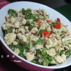 倒入大蒜和辣椒和滑散的鸡肉迅速来回翻炒,可根据自己喜欢肉的老嫩口味来掌握翻炒的时间。