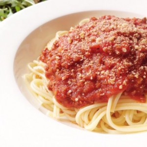 这时候面煮的刚刚好,用叉子卷起面摆入盘中,浇上稍多的番茄牛肉酱,最后刨入帕玛森干酪,大功告成
