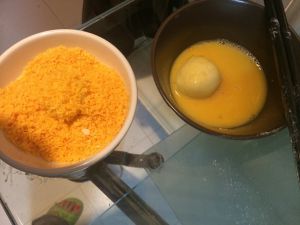 先沾鸡蛋~后沾面包糠~ 滚啊滚啊滚~~