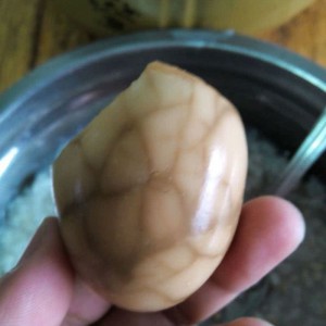 放凉了的鸡蛋,敲破,加水,水要多一点,大概体积是鸡蛋的3到4倍。加入肉桂,老姜,八角,茶叶,盐,鸡精,酱油。
