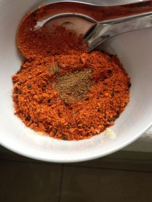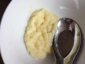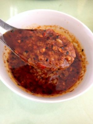 放入辣椒面和花椒面,把蒜泥和辣椒面中间挖坑