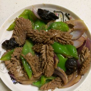 热锅冷油,等油温上来后加姜丝少许爆香倒入洋葱木耳辣椒,翻炒,加盐一茶匙,糖半茶匙,料酒少许,蚝油少许翻炒至洋葱稍微变色,倒入腰花翻炒,半分钟倒入水淀粉勾芡,出锅。我的菜里不加鸡精和味精,所以味道没有饭店的鲜,如果个人想加也可在出锅前加入鸡精。