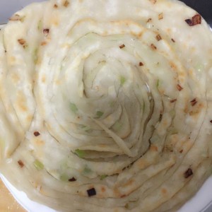 电饼档放油预热,把卷好的葱油饼擀成薄饼