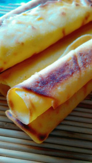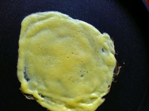 将面糊平铺在电饼铛上,开始加热,边缘变色时翻面;