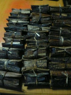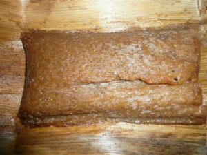 蒸制。竖立码放入笼,不可叠过多以免影响形态。旺火大气后加盖蒸制90min左右后改为小火蒸(旱)制4至8小时即可出笼。散水。成熟制品稍凉后,独立放置晾凉,以便减少其水分含量亦即提高硬度延长保存时间。(图示刚出锅成品色状)