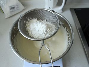筛入低粉,轻轻快速切拌均匀。注意切拌手法避免消泡严重,