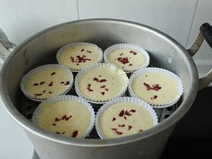 将纸模放入蛋糕托,将拌好的蛋糕糊倒入纸模中,表面撒蔓越莓干装饰。