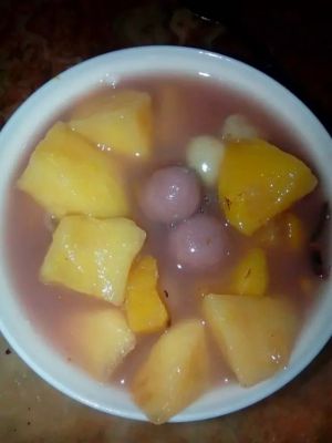 将水果切块,放入沸水中煮几分钟后,放入做好的水果汤圆,等到汤圆在水中浮起即可盛出,开吃咯!