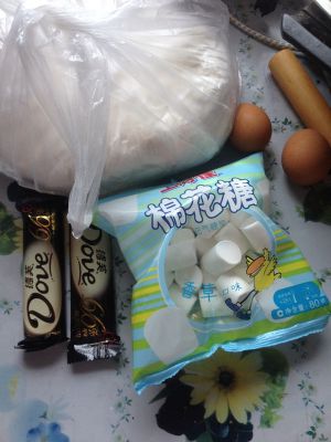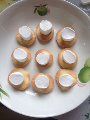 蛋糕胚底部朝上,平铺在碟子上,表面放半颗棉花糖