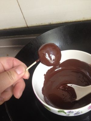 甩掉多余的巧克力,牙签另一端扎进事先准备好的泡沫上晾干