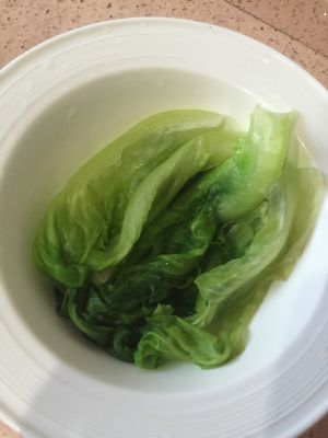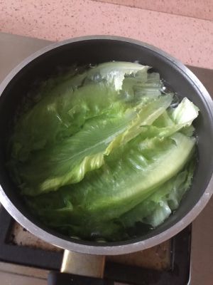 在(四)翻滚的同时,另用一锅烧开水,把生菜灼一灼。(五)