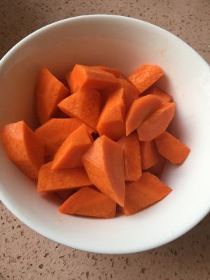 备材料:红萝卜,一根对半切开,再切成小件,方便孩子进吃。