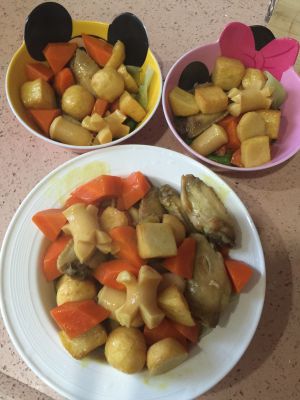 在鸡中翅(一)煎至两面有色,可+鱼蛋+香肠=(二)