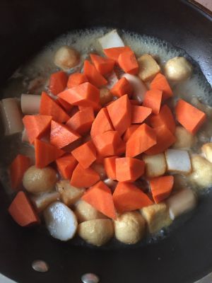 在(三)水开之时,加入红萝卜(如果切得大块的亲,水必须多一点点,这样子可以避免汁收了,红萝卜未全熟,如果喜欢有点脆脆的,可不加多水) (四)