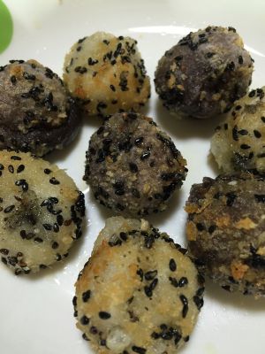 面包糠和熟芝麻混合均匀,汤圆沾水,均匀的裹上一层面包糠和芝麻