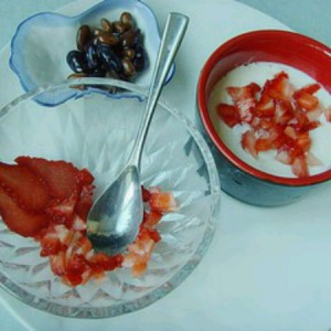 材料:纯牛奶、白糖、鸡蛋、蜜豆、草莓
