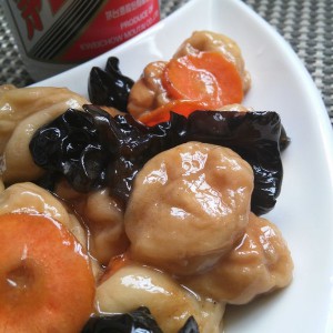 放黑木耳,加高汤(没有加水)加糖,盐。勾薄芡。