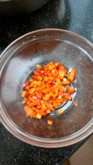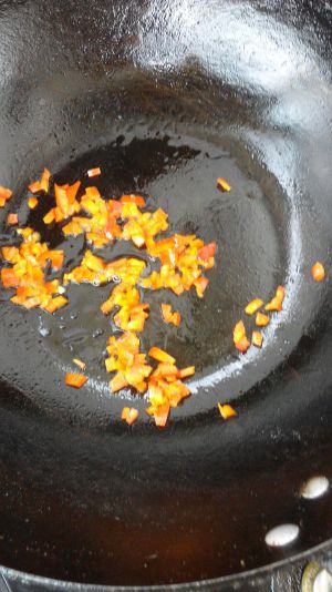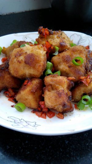 鸡块装盘撒上红椒粒,和香葱粒即可。