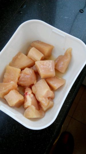 鸡脯肉洗净切块。料酒。姜片,盐。黑胡椒粉,孜然粉,淀粉。抓匀。腌渍。