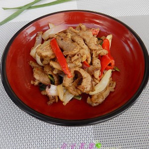 羊肉煸至变色。加入洋葱丝、红椒丝和蒜苗。
