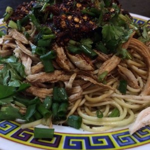 取盘子,夹一人份的凉面,上面放适量的鸡丝,放姜蒜末,葱花,香菜末,盐,鸡精,酱油,醋,一点白糖,花椒油,辣椒油(不喜欢姜蒜的朋友可以不放)。