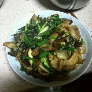 加青蒜,干咸菜继续翻炒至蒜苗炒蔫,香味浓郁,加入味精,装盘