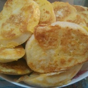 鸡蛋打散,可以加一点点盐。我这是三个馒头,一开始打了三个鸡蛋后来不够,又加了一个,刚刚好