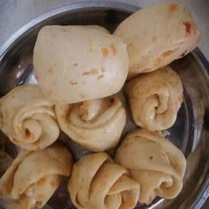 一斤面粉,把发酵粉放入温水中稀释加入一勺白糖。然后倒入面粉中,和面。白糖有助于发面