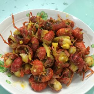 小龙虾去头去沙线、用黄酒、盐、姜丝、葱段腌制半小时,热锅倒入植物油,九成热,倒入腌制好的小龙虾炸二十秒捞起