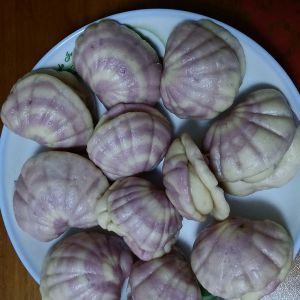 把两个不同颜色的面团擀成面皮,卷在一起,切成段,再压扁,用叉子按上贝壳的花纹,用筷子从中间一夹,然后在里面放上红枣或面团,放在贝壳里就做好了。