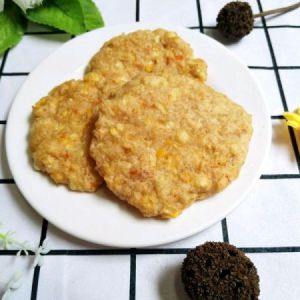 带上一次性手套,抓取适量的玉米虾肉泥在手里拍扁
