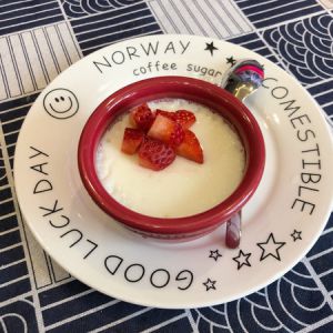 晾凉的双皮奶摆上水果装饰(我的浮沫没有撇干净所以蒸出来的双皮奶有小泡泡不平整、不过自己吃没关系啦~)