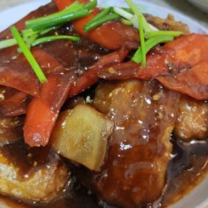另起热锅凉油,5成热时加姜片辣椒片,大蒜碎,花椒,炒香后加入煎好的鱼块,加适量清水转大火,淋老抽上色