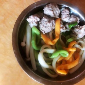 水开下锅烫面条,中途加2-3次凉水,烫熟捞起,配上猪肉丸、牛肉丸菌菇高汤~爽歪歪的哦,开吃啦!