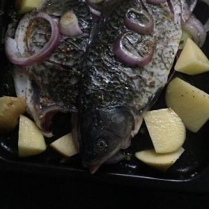 烤盘放油,洋葱圈,生姜片,葱段,将腌制好的鱼放烤盘上,入烤箱200度烤30分钟(鱼大的可以烤更长时间)。