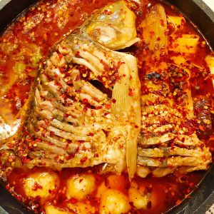 锅中倒入适量油烧热,浇在撒满辣椒粉和麻椒的鱼身上,水煮鱼就完成了