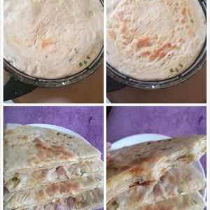然后就是放调料了,一调羹勺的油均匀的抹在面皮上,然后撒食盐,最好是那种细盐,不要稍粗的那种碘盐。然后撒花椒面,葱花,一定均匀撒,不然你吃的时候你就知道了哈哈。