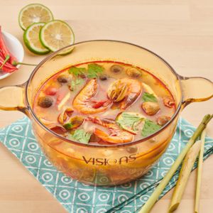 取一只VISIONS晶彩透明锅,倒入清水,开火,将蛤蜊、虾、鱿鱼圈煮到八成熟后捞出,放入凉水,备用。