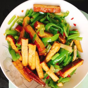 将锅清洗干净,打开燃气,将锅中多余的水分蒸发掉,倒入适量食用油,加热,再倒入切好沥干水分的香干,将其炸至香干酥脆,两年金黄,然后捞出,盛入碗中。将锅中的油,加热,倒入切好的蒜末煸香,再倒入切好的辣椒末,翻炒几下,倒入青椒和香芹,倒入适量的食盐,花椒粉和耗油,用锅铲不停翻炒,待芹菜辣椒熟了之后,即可关火,盛入碗中。