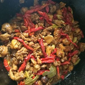 起锅加油放糖,熬糖色,糖起泡后倒入腌制的鸡块。鸡块翻炒不用太勤,水快干前加小泡椒少量盐,水炒干了鸡块就上色了。加入味极鲜红烧酱油蚝油混合液,放入干辣椒,炒几下。铺上香菇焖5分钟,太干的话加少量啤酒。
