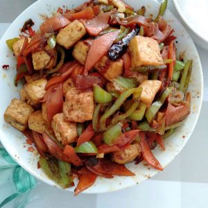 配菜放入豆腐,盐适量,蒜适量(不喜欢可以不放)翻炒一会加鸡精适量就可以出锅了!