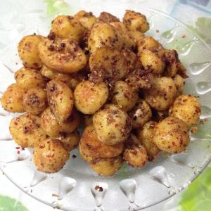 把锅里的油倒出来后把炸好的土豆放进去,然后开始放佐料,根据个人口味。最后加一点点白糖