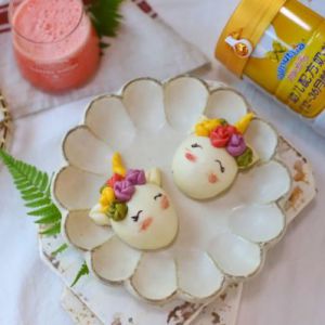 重复以上步骤,将剩余的红色面团、绿色面团和紫色面团做成花朵,蘸取牛奶贴在合适位置,当作独角兽的头饰