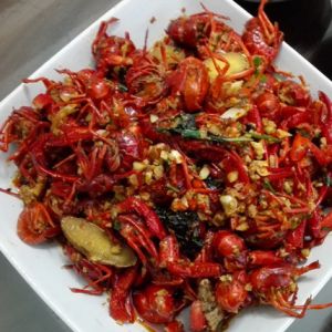 龙虾过油锅,放入姜片,放入盐,随即倒入龙虾煸炸龙虾变红,起锅放置一边沥油。