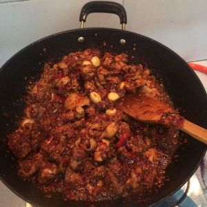 锅里多倒点菜油,油熟以后放入适量糍粑辣椒(其实就是干辣椒泡发以后与姜蒜打成的),八角,大蒜炒至香(10分钟左右)