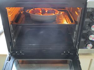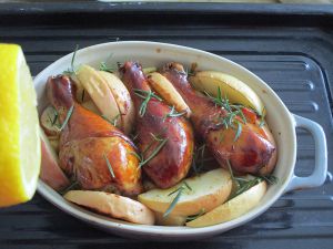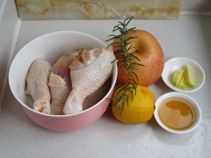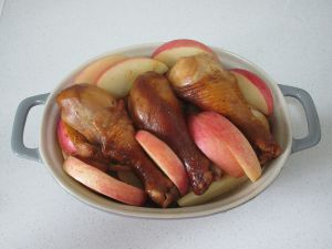 烤盘里先铺上一层苹果片再把鸡腿加入,空隙的地方都加入苹果片