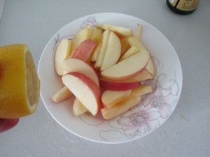 进微波炉的同时把苹果洗净切成均匀的片后挤入柠檬汁拌匀增味和防止氧化后变色